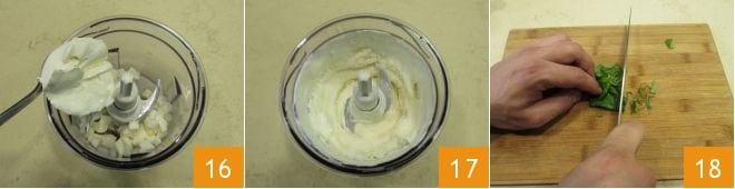 Fügen Sie auch den Frischkäse hinzu 16 und mixen Sie die Zutaten, bis Sie eine glatte und homogene Creme erhalten 17, die Sie in eine kleine Schüssel geben. Spülen Sie dann das Basilikum ab, trocknen Sie es vorsichtig mit einem sauberen Tuch und schneiden Sie es in feine Streifen 18.