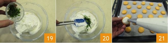 Fügen Sie es der Käsemischung hinzu 19 und rühren Sie mit einem Spatel um 20. Füllen Sie die Käsecreme in einen Spritzbeutel mit glatter Tülle und geben Sie sie auf die flache Seite einer Meringue-Schale 21.