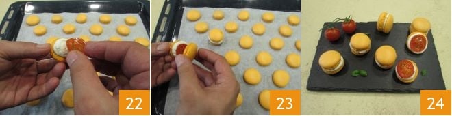 Auf die Creme legen Sie eine Tomatenscheibe 22, dann setzen Sie eine zweite Meringue-Schale darauf 23. Wiederholen Sie den Vorgang für alle verfügbaren Schalen, bis Sie die 35 Macarons zusammengestellt haben. An diesem Punkt sind Ihre Caprese Macarons bereit, für einen köstlichen Aperitif serviert zu werden 24!