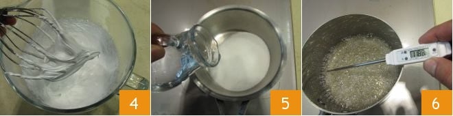Rühren Sie auf mittlerer Geschwindigkeit und schlagen Sie das Eiweiß steif 4. In der Zwischenzeit lösen Sie den Zucker und das Wasser bei niedriger Hitze in einem kleinen Topf auf 5. Rühren Sie die Zutaten, um den Zucker gleichmäßig aufzulösen und Klumpenbildung zu vermeiden. Erhitzen Sie, bis Sie eine Temperatur von 118° erreichen (dies können Sie mit einem Küchenthermometer überprüfen) 6.