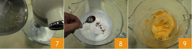 Gießen Sie nun den Sirup in das steif geschlagene Eiweiß 7. Fahren Sie fort, die Zutaten mit dem Schneebesen gut zu vermischen, bis das Eiweiß steif geschlagen ist und die Mischung abgekühlt ist. Dann stoppen Sie die Küchenmaschine und fügen Sie die gelbe und rote Lebensmittelfarbe hinzu 8. Rühren Sie vorsichtig mit einem Spatel oder auf niedriger Geschwindigkeit mit der Küchenmaschine, bis Sie eine gleichmäßige Färbung erhalten, ohne das Eiweiß zu entlüften 9.