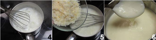 und vermischen Sie die gesamte Masse gut mit dem Schneebesen 4. Rühren Sie weiter und lassen Sie die Mischung bei niedriger Hitze kochen, bis sie eingedickt ist. Nehmen Sie den Topf vom Herd und geben Sie den geriebenen Parmigiano Reggiano nach und nach hinzu 5. Mischen Sie den Parmesan gut mit der Béchamelsoße 6 und stellen Sie sie beiseite.