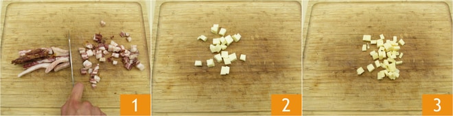 Um die Maccheroncini al Rauch zuzubereiten, beginnen Sie damit, den geräucherten Speck in Würfel zu schneiden 1. Schneiden Sie auch den Caciotta 2 und den Emmentaler 3 in Würfel.