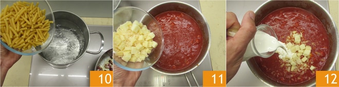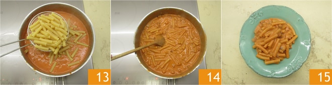 Kochen Sie die Pasta al dente 10. Am Ende des Kochvorgangs der Pasta geben Sie einen Teil der Käsemischung hinzu 11 und mischen Sie es. Fügen Sie auch die Sahne hinzu 12 und vermengen Sie alles noch einmal.