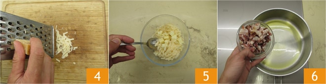 Reiben Sie den Parmesan 4 und geben Sie alle Käsesorten in eine Schüssel 5. In der Zwischenzeit stellen Sie einen Topf mit Wasser auf den Herd und salzen es, wenn es kocht, dies wird für das Kochen der Pasta benötigt. Erhitzen Sie in einem Topf etwas Öl und fügen Sie den Speck hinzu 6.