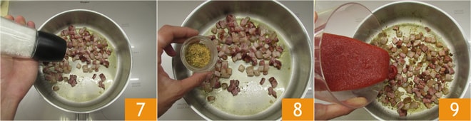 Salzen Sie 7 und geben Sie dann die Gewürzmischung hinzu 8. Lassen Sie es ein paar Sekunden einziehen, dann fügen Sie das Tomatenpüree hinzu 9 und kochen es mindestens 10 Minuten lang.