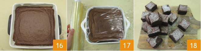 Nach dem Backen 16 sollte der Kuchen oben fest und innen cremig sein, prüft also mit einem Zahnstocher, ob er nicht mehr flüssig ist. Lasst ihn vollständig in der Form abkühlen, dann deckt ihn mit Frischhaltefolie ab und stellt ihn für mindestens 2 Stunden in den Kühlschrank, um ihn fest werden zu lassen 17. Nach dieser Zeit stürzt den Kuchen und glättet die Ränder mit einem angefeuchteten Messer oder einem Nylonfaden, dann schneidet ihn in Würfel und bestäubt ihn nach Belieben mit Puderzucker: der magische Schokoladenkuchen ist bereit zum Servieren 18!