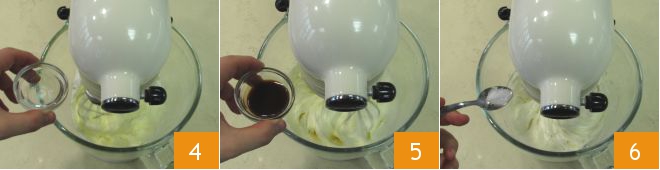 Nach etwa 5-6 Minuten wird die Mischung hell und schaumig, dann fügt ihr nach und nach das kalte Wasser 4, den Vanilleextrakt 5 und das Salz 6 hinzu.