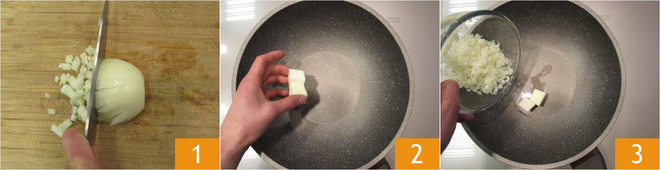 Um das Risotto alla Milanese ohne Knochenmark zuzubereiten, sollten Sie etwa 1 Liter klassischen Fleischbrühe bereit haben, die immer sehr heiß gehalten wird. Schälen und hacken Sie eine halbe weiße Zwiebel fein 1. In einer großen Pfanne 25 g Butter 2 erhitzen und die gehackte Zwiebel dazugeben 3. Lassen Sie sie bei mittlerer Hitze unter gelegentlichem Rühren weich werden.