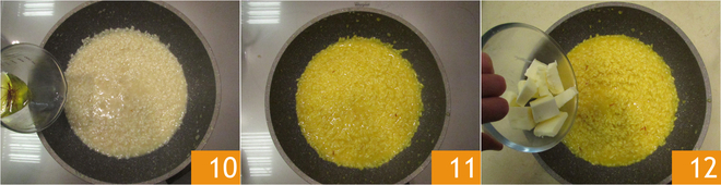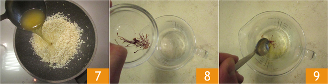 Geben Sie die sehr heiße Brühe hinzu, bis der Reis bedeckt ist, und fahren Sie mit dem Kochen bei starker Hitze fort, wobei Sie bei Bedarf heiße Brühe hinzufügen 7. Weichen Sie die Safranfäden vorsichtig in heißem Wasser ein 8, rühren Sie leicht um, damit sie aufquellen 9.