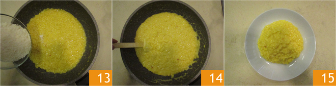 Fügen Sie auch den geriebenen Parmigiano Reggiano DOP hinzu 13 und rühren Sie kräftig 14, so dass die eiskalte Butter und der Käse den thermischen Schock erzeugen, der die Cremigkeit und den Glanz des Risottos fördert. Servieren Sie das Risotto alla Milanese ohne Knochenmark heiß 15!
