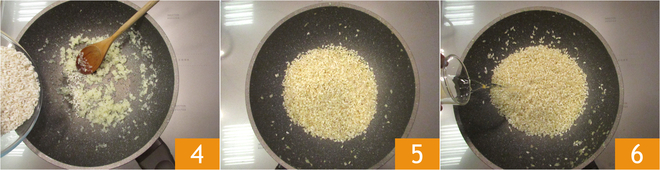 Sobald sie gebräunt ist, können Sie den Carnaroli-Reis 4 hinzufügen: Der Reis wird die Butter aufnehmen und sich mit der Zwiebel verbinden. Wenn er angeröstet und glasig ist 5, können Sie ihn mit Weißwein ablöschen 6. Lassen Sie den Alkohol einige Augenblicke verfliegen.