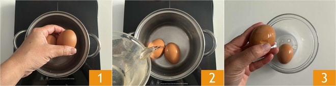 Um die Mayonnaise mit hartgekochten Eiern zuzubereiten, beginnen Sie mit dem Kochen der Eier. Legen Sie die Eier in einen kleinen Topf 1 und bedecken Sie sie mit reichlich Wasser, stellen Sie den Topf auf den Herd, bringen Sie das Wasser zum Kochen und kochen Sie die Eier 9 Minuten lang, ab dem Zeitpunkt, an dem das Wasser kocht 2. Nach der Kochzeit die Eier auf Raumtemperatur abkühlen lassen oder, um es zu beschleunigen, unter fließendem Wasser. Schlagen Sie die Eier leicht an, um die Schale zu brechen 3.