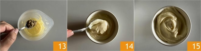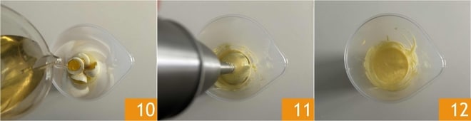 Gießen Sie das Pflanzenöl hinzu 10, dann pürieren Sie alles mit dem Stabmixer 11, bis eine luftige, weiche und gleichmäßige Masse entsteht 12.