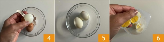 Entfernen Sie nun vorsichtig die Schale 4 von beiden Eiern 5 und schneiden Sie sie in zwei Hälften 6.