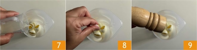 Geben Sie anschließend die Eier in den Behälter eines Stabmixers, fügen Sie den Zitronensaft hinzu 7, eine Prise Salz 8 und eine Prise Pfeffer 9.