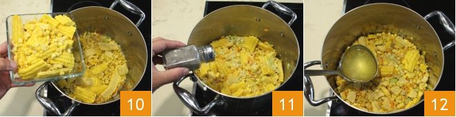Wenn das Gemüse des Sautées gut gebräunt ist, fügen Sie die Maiskörner hinzu 10 und lassen Sie sie 5-6 Minuten bei schwacher Hitze durchziehen. Dann salzen und pfeffern Sie nach Geschmack 11, geben Sie die Gemüsebrühe hinzu, bis die Mischung bedeckt ist 12, und lassen Sie sie etwa 35 Minuten kochen. Um zu erfahren, wie Sie die Gemüsebrühe am besten zubereiten, besuchen Sie die Kochschule: Gemüsebrühe.