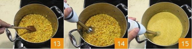 Rühren Sie gelegentlich um und wenn die Mischung weich geworden ist und einen Teil der Brühe aufgenommen hat 13, führen Sie den Stabmixer in den Topf ein 14 und pürieren Sie, bis Sie eine dichte und homogene Mischung erhalten 15, ggf. Brühe hinzufügen. Lassen Sie es etwa 5 Minuten weiterkochen und schalten Sie dann das Feuer aus.