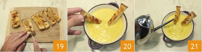 Nach dieser Zeit nehmen Sie alles aus dem Ofen und lassen Sie die Brotscheiben auf einem Gitter abkühlen, dann legen Sie sie auf ein Schneidebrett und halbieren Sie sie der Länge nach, um Sticks 19 zu bilden oder Würfel zu schneiden. Richten Sie die Maissuppe an und servieren Sie sie mit den Croutons 20. Bestreuen Sie alles mit einer Prise Pfeffer und schließen Sie mit einem Schuss Öl ab 21: Jetzt müssen Sie nur noch die Maissuppe mit den Croutons heiß servieren und genießen!