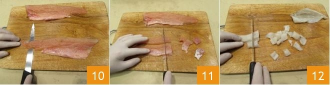 Lassen Sie dann die Klinge eines Messers zwischen dem Fischfleisch und der Haut gleiten, um das Filet zu schneiden 10. Schneiden Sie es dann in Würfel 11, die Sie beiseite legen. Schneiden Sie auch den Plattfisch in Würfel gleicher Größe 12 und legen Sie sie ebenfalls beiseite.