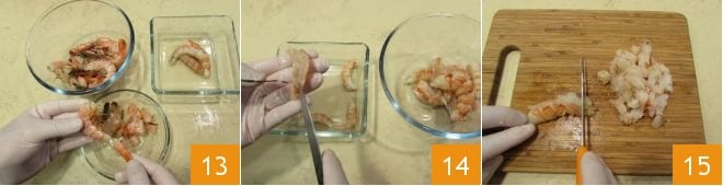 Jetzt kümmern Sie sich um die Garnelen: Entfernen Sie den Kopf und die Beine; verfahren Sie genauso mit dem Panzer und entfernen Sie auch den Schwanz 13. Schneiden Sie den Rücken der Garnele mit einem kleinen Messer ein und entfernen Sie den Darm, achten Sie darauf, ihn nicht zu zerbrechen, um ihn vollständig herauszuziehen 14: Schneiden Sie auch die Garnelen in Stücke 15 und legen Sie sie beiseite.