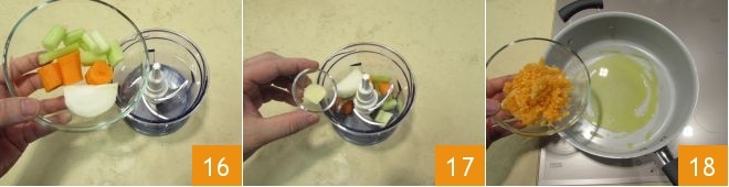 Nehmen Sie die Karotten, schälen Sie sie und schneiden Sie sie in Stücke, schälen Sie die Zwiebel und schneiden Sie sie ebenfalls in Stücke, machen Sie dasselbe mit dem Sellerie. Geben Sie das Gemüse in einen Mixer 16. Geben Sie auch den Knoblauch dazu 17 und hacken Sie die Zutaten fein, die Sie in eine breite, mit Öl beträufelte Antihaftpfanne geben 18: Dünsten Sie alles bei sehr niedriger Hitze etwa 10-12 Minuten lang.