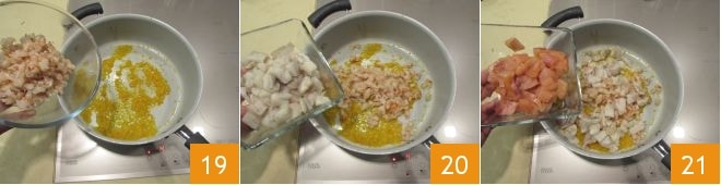 Fügen Sie nun die Garnelen in die Pfanne 19. Geben Sie auch den Plattfisch 20 und die Forelle 21 dazu: und braten Sie sie bei starker Hitze etwa 5-6 Minuten an, dabei ständig mit einem Kochlöffel rühren, um ein Anhaften am Pfannenboden zu vermeiden.
