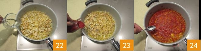 Löschen Sie mit Weißwein ab 22 und lassen Sie ihn verdampfen. Geben Sie nun die Tomatensauce 23 und den Zucker 24 hinzu: Rühren Sie die Zutaten gut um, um sie zu vermengen.
