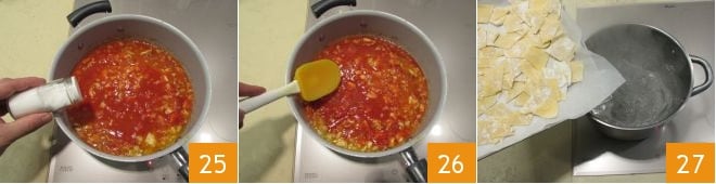 Würzen Sie mit Salz 25 und Pfeffer, rühren Sie die Zutaten gut um 26. Dann die Hitze reduzieren: Lassen Sie alles etwa 10-15 Minuten köcheln. Wenn nur noch wenige Minuten bis zum Ende der Garzeit verbleiben, kochen Sie die Maltagliati in einem Topf mit reichlich gesalzenem Wasser etwa 3 Minuten lang 27.