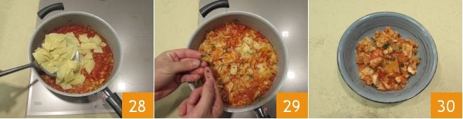 Wenn sie al dente sind, geben Sie sie in die Pfanne mit dem Ragout 28 und vermischen Sie sie mit der Sauce. Aromatisieren Sie mit zuvor gewaschenen und getrockneten Thymianblättern 29 und servieren Sie schließlich Ihre Maltagliati mit Fischragout 30!