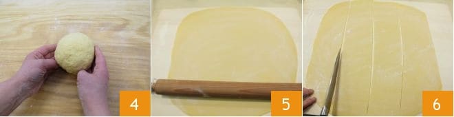 Formen Sie den Teig zu einer Kugel 4 und wickeln Sie ihn in transparente Frischhaltefolie; lassen Sie ihn mindestens 30 Minuten an einem kühlen und trockenen Ort ruhen. Nach der erforderlichen Zeit nehmen Sie den Teig und entfernen die Frischhaltefolie. Rollen Sie den Teig mit einem Nudelholz aus, bis Sie eine dünne Schicht von 1-2 mm Dicke erhalten 5. Schneiden Sie dann Streifen heraus 6