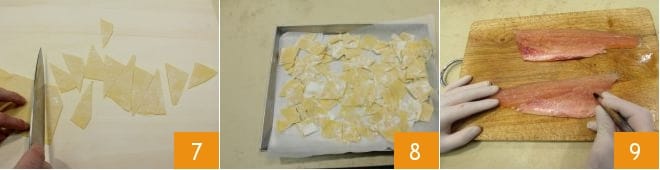und schneiden Sie sie unregelmäßig, um die Maltagliati herzustellen 7. Versuchen Sie jedoch, alle etwa gleich groß zu machen. Während Sie die Maltagliati herstellen, legen Sie sie auf ein leicht mit Grießmehl bestäubtes Tablett, das Sie auch darüber streuen können, um ein Zusammenkleben zu verhindern. Mit Grießmehl verhindern Sie, dass die frische Pasta das Mehl aufnimmt 8: Legen Sie sie beiseite. Dann fahren Sie mit der Reinigung des Fisches fort: Nehmen Sie die Forelle und entfernen Sie die Gräten mit einer Küchenpinzette 9.