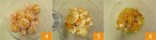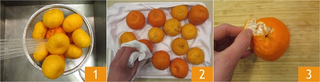 Um den Mandarinenlikör zuzubereiten, waschen Sie zuerst die Mandarinen unter fließendem Wasser 1 und trocknen Sie sie sorgfältig mit einem sauberen Tuch ab 2, dann schälen Sie sie vorsichtig 3.