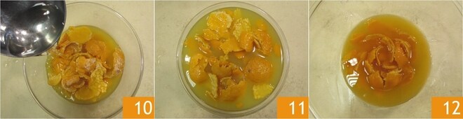 Nachdem Sie die Früchte von den Schalen getrennt haben 4, bedecken Sie letztere mit reinem Alkohol 5. Lassen Sie sie 5 Tage lang bei Raumtemperatur ziehen, abgedeckt mit Frischhaltefolie, an einem kühlen, lichtgeschützten Ort 6. Denken Sie daran, die Mischung einmal täglich zu schütteln.