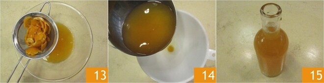 Filtern Sie die Mischung, um die Schalen zu entfernen 13 und füllen Sie sie in Flaschen um 14. Ihr Mandarinenlikör ist bereit, gut gekühlt genossen zu werden 15!
