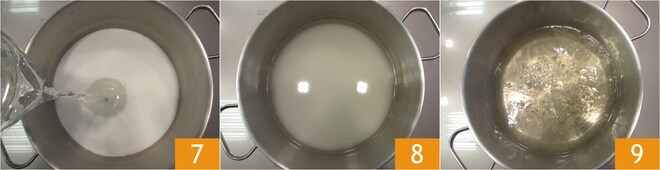 Nach dieser Zeit bereiten Sie den Sirup vor: Geben Sie Zucker und Wasser in einen Topf 7, stellen Sie die Hitze an 8 und warten Sie, bis es kocht 9, dann schalten Sie aus und lassen Sie es vollständig abkühlen.