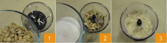 Um die Mandelgebäcke zuzubereiten, geben Sie die geschälten Mandeln 1 und den Zucker 2 in einen mit Stahlklingen ausgestatteten Mixer und zerkleinern Sie sie, bis sie zu Pulver werden 3. Denken Sie daran, dass dieser Schritt nur wenige Minuten dauern sollte, um zu verhindern, dass die Mandeln überhitzen und ihr Öl freisetzen.