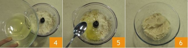 Fügen Sie die Eiweiße 4 und das Mandelaroma 5 hinzu und mixen Sie erneut, um alles zu vermischen. Der Teig ist fertig, wenn er kompakt, aber weich im Griff ist 6, dann geben Sie ihn in einen stabilen Spritzbeutel mit einer gezackten Tülle von 10 mm.