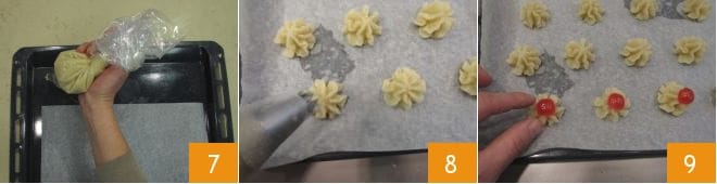 Legen Sie ein Backblech mit Backpapier aus, das Sie besser befestigen können, indem Sie ein wenig Teig in die 4 Ecken des Blechs drücken 7. Formen Sie kleine Häufchen mit einem Durchmesser von 3 cm und einer Höhe von etwa 2 cm 8 und garnieren Sie einen Teil davon mit den in Hälften geschnittenen kandierten Kirschen 9