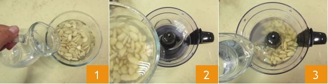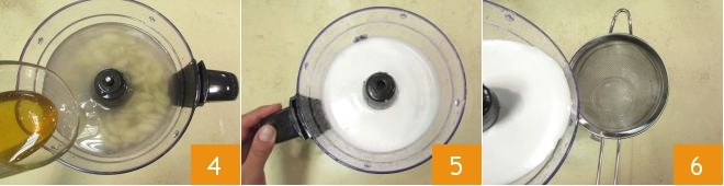 Um Mandelmilch zuzubereiten, legen Sie zuerst die Mandeln in eine Schüssel mit 500 g Wasser für mindestens eine Stunde ein 1. Nach dieser Zeit geben Sie sowohl die Mandeln als auch das Wasser in einen Mixer mit Stahlklingen 2, dann fügen Sie die restlichen 500 g Wasser hinzu 3