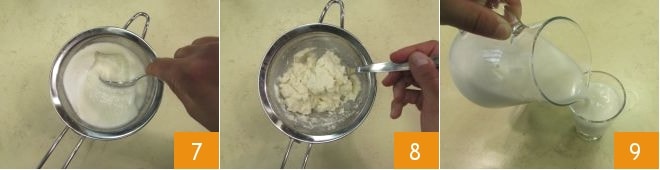 Rühren Sie gut mit einem Löffel, um die flüssige von der festen Masse zu trennen (7-8), dann stellen Sie die Schüssel, in der Sie die Flüssigkeit gesammelt haben, für mindestens eine Stunde in den Kühlschrank, abgedeckt mit Frischhaltefolie. Servieren Sie Ihre Mandelmilch kalt oder bei Zimmertemperatur 9!