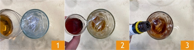 Um den Manhattan zuzubereiten, gießen Sie den Roggenwhiskey in ein mit Eis gefülltes Rührglas 1. Fügen Sie nun den süßen roten Wermut hinzu 2 und einen Tropfen Angostura 3.