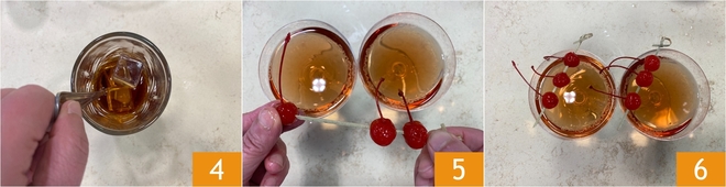 Mit einem Barlöffel, also einem mit langem Stiel, rühren Sie die Zutaten gut um 4. Gießen Sie den Drink in zwei Gläser. Dekorieren Sie die Drinks mit den Kirschen; wir haben 3 pro Glas verwendet und sie auf einen Zahnstocher gesteckt 5. Ihr Manhattan-Cocktail ist servierfertig 6!