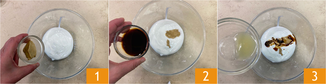 Um das marinierte Hähnchen zuzubereiten, geben Sie zuerst den Joghurt in eine Schüssel. Fügen Sie den Senf 1, die Sojasauce 2 und den Zitronensaft 3 hinzu.