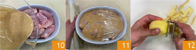 Gießen Sie die restliche Sauce darüber 10 und bedecken Sie sie mit Frischhaltefolie 11. Lassen Sie sie 30 Minuten im Kühlschrank marinieren. Schälen Sie in der Zwischenzeit die Kartoffeln 12.