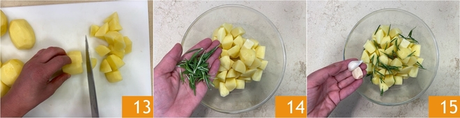 Schneiden Sie sie dann in Würfel 13 und geben Sie sie in eine Schüssel. Fügen Sie den Rosmarin 14 und den Knoblauch 15 hinzu.