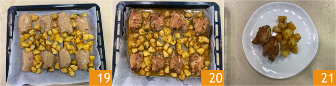 Ordnen Sie Hähnchen und Kartoffeln ordentlich auf einem mit Backpapier ausgelegten Backblech an 19. Backen Sie sie im vorgeheizten statischen Ofen bei 200° für 45 Minuten, schalten Sie in den letzten 10 Minuten den Grill ein, um eine knusprige Kruste zu erhalten. Nehmen Sie sie aus dem Ofen 20 und servieren Sie sofort Ihr mariniertes Hähnchen mit Kartoffeln 21!