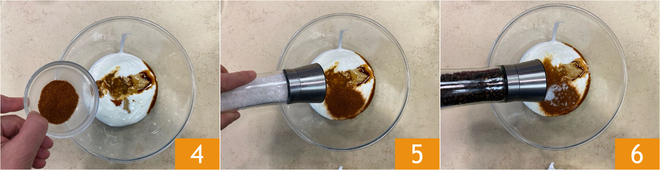 Fügen Sie auch die Hälfte der Paprika 4, das Salz 5 und den Pfeffer 6 hinzu.