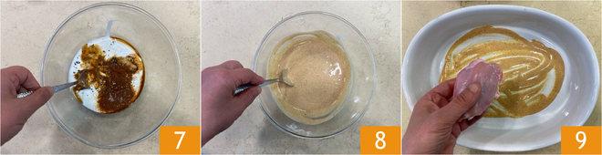 Vermischen Sie alles 7, bis Sie eine homogene Sauce 8 erhalten. Verteilen Sie etwas Sauce auf dem Boden einer Auflaufform und fügen Sie die Hähnchenschenkel ohne Haut hinzu 9.