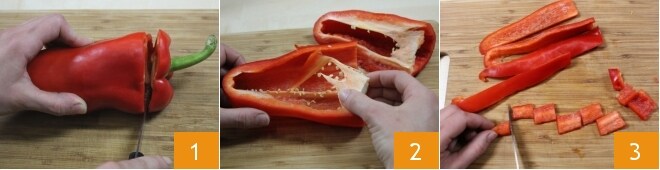 Um die scharfe Paprikamarmelade vorzubereiten, beginnen Sie mit den Paprika: Waschen Sie sie, trocknen Sie sie ab und schneiden Sie den oberen Teil ab 1, dann halbieren Sie sie längs und entfernen Sie die weißen Innenfäden und die Kerne 2. Schneiden Sie sie schließlich in Stücke 3.